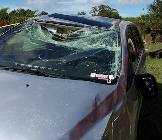 I have been having some really bad migraines, to the point where my pcp referred me to a neurologist, and sent me for an MRI. My migraines were getting so bad that I was taking so much medication that it was really messing with me, I was having memory issues, and sleepwalking all kinds of odd stuff, and then I had my car wreck. Yeah it was bad, and frankly I shouldn't be here typing this post, I rolled my car 4 times and hit a telephone pole, but my airbag didn't go off. Had it, my head would have been smashed like a pumpkin. I was actually swerving to avoid a deer, and ended up in a soybean field. There was a car in front of me who had seen everything, and she got out of her car and told me she had called 911 and that we had to get Lauryn out of the car. We tried to pull her door open, but it just wouldn't give, so we ran around, turned off the car, and opened the back passenger door. I got Lauryn out of her car seat, out of the car, wrapped my arms around her and sank to the ground bawling that she was ok. I on the other hand was not I had cuts all over my legs and arms from the windshield shattering, and the seat belt literally gave me a "road rash". They forced me to give Lauryn up and go lay on the road because I had a HUGE bump on my forehead, and the lady said she thought I probably had a concussion, so she wanted me to lay down until the ambulance got there. Ambulance comes, you know the drill.... back board all that fun shit, I had to call a friend to come up and get Lauryn so that she didn't have to go to the hospital with me (she was totally unharmed BTW, Thank God for Britax Car seats!!!), but I don't remember any of it honestly the last thing I remember is the part about getting Lauryn out of the car and being laid down on the road, everything after that.... fuzzy. I was in shock. So get cat scan slight concussion, here are some pain meds... yummy!!! :o) Then in comes the trooper to ask me what happened, I told him all I could tell him was I swerved to miss a deer, and that I remember the car rolling, and what I wrote above but that that was it. So, this Jackwagon asks me if I had had anything to drink before I left the house that morning, I told him yeah coffee, wasn't that what was all over the inside of my car. Then he asks if I was on drugs, I told him that I take medication for my migraines, but on mornings when I drop Lauryn off at preschool, I wait to take them til after I get home because of any possible effect they may have. Well about that time Keith shows up, the Trooper, pulls him out in the hall, tells him I was speeding, and that people smelled alcohol on my breath, and that my best friend had told him that I was on drugs (she was the one they released Lauryn to) and that I better pray that my tox screen comes back with only the meds the doc prescribed or he is going to get me for DUI..... whatever, I don't even drink, and I hadn't taken my meds that morning so it came back clean. I think he was actually pissed that it did, because he got in my face and asked me what I had learned for this experience, and I looked him square in the face and told him "Next time Bambi's ass is fucking Mine!!" The nurse that was checking my IV almost pissed her pants to keep from laughing. I had no cares by then due to all the drugs they had pumped into me, and he was being a jerk off anyway, so whatever. He actually gave me a ticket to, get this for "Failing to maintain my lane." Ya think dumb ass?? I totaled my car, almost got killed, and you just HAD to give me a ticket.... It got dismissed by the DA last week after I told her what had happened. He was just being a douche buy giving me a ticket because I wasn't letting him get away with the even mere suggestion that I would drink, or do any kind of drugs for that matter when I had to drive my baby girl to school. Here are some pics for you to see.....